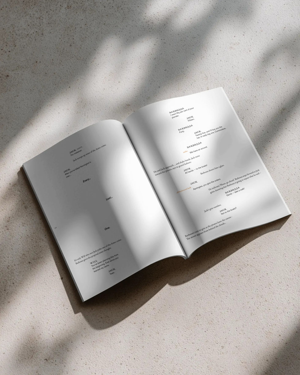 This book contains the complete script of Pirates of the Caribbean: The Curse of the Black Pearl, reformatted into a play-like structure with specialized indents, fonts, and sizing for each character and important plot point. The 2003 film's entire 2 hour and 23 minute runtime is reimagined into 209 swashbuckling pages.